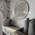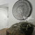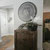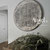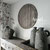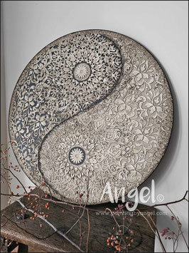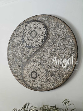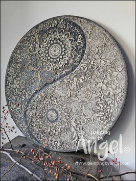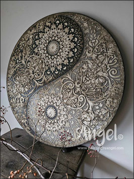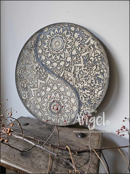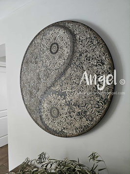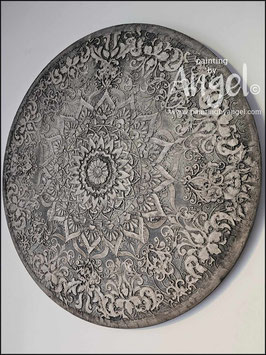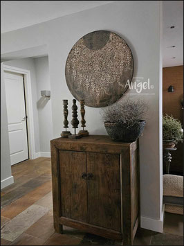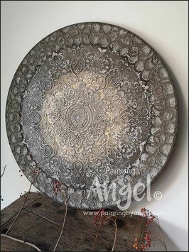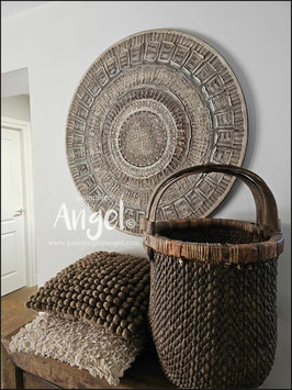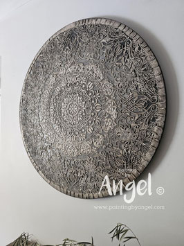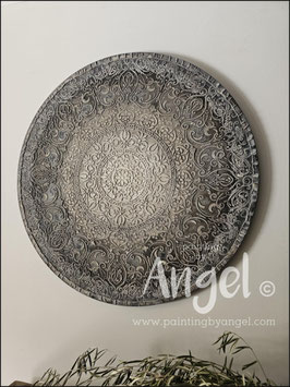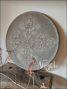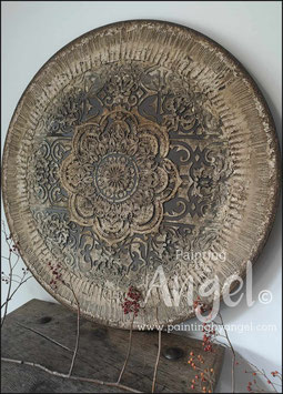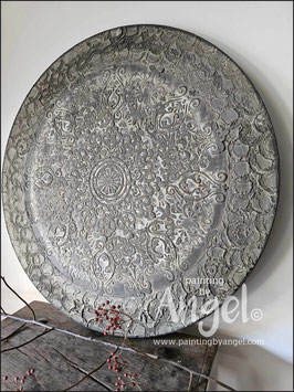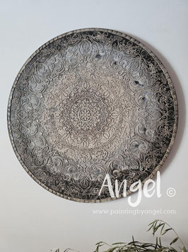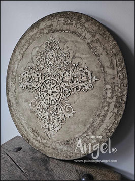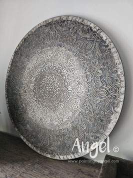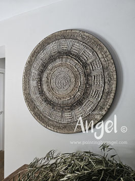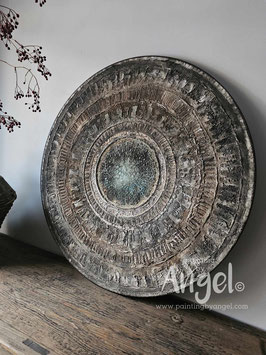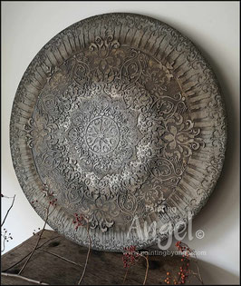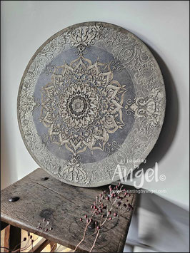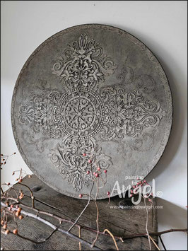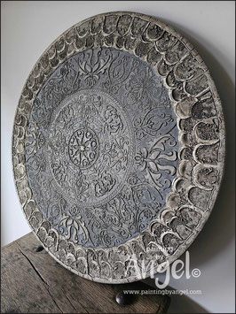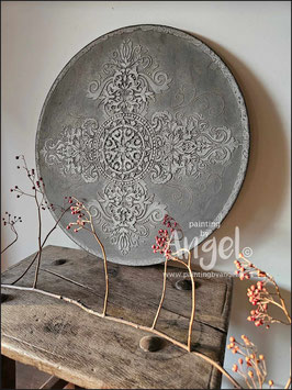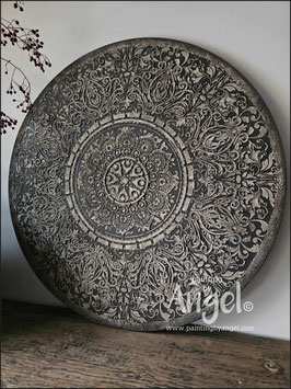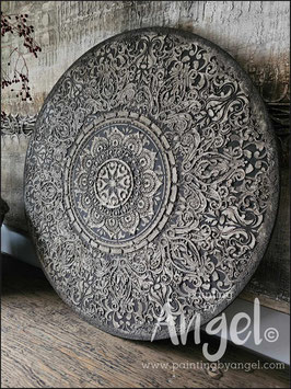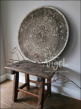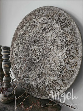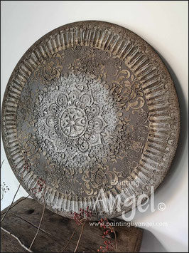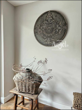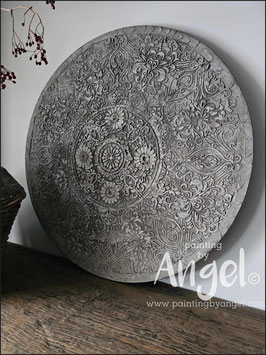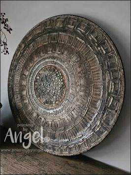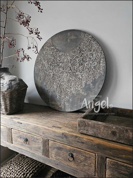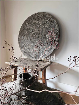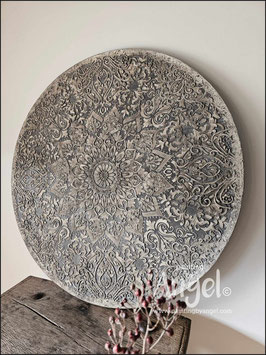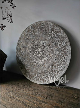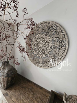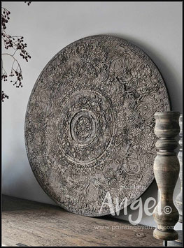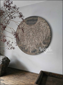 Landelijke muurcirkel voorzien van een versteende mandala print in rustiek verkalkt antraciet en lichte tingloed gecombineerd met een lichte aardetint, diameter 80cm, deze afmeting zal met DHL verzonden worden daardoor kan het pakket iets langer onderweg zijn.