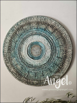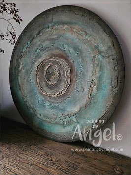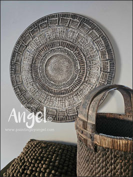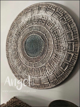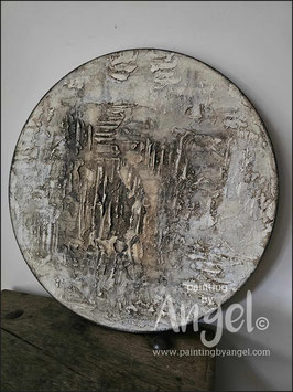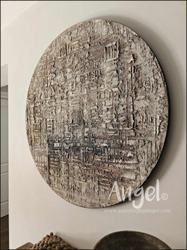 Abstract landelijke muurcirkel volledig voorzien van versteende texturen in naturel aardetinten gecombineerd met grijs en bruin tinten, diameter 80cm, deze afmeting cirkel zal met DHL verzonden worden en daardoor kan het pakket iets langer onderweg zijn.