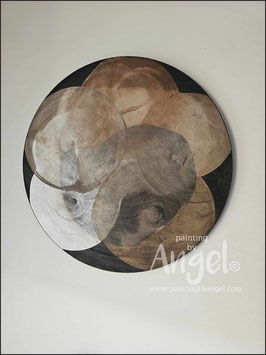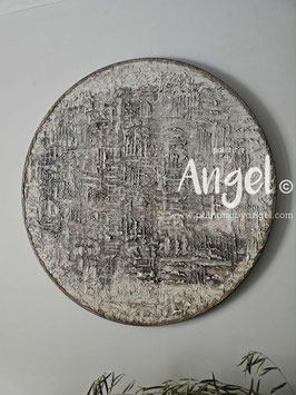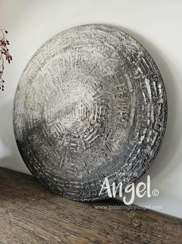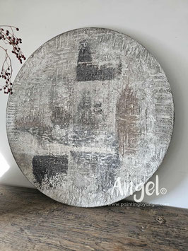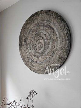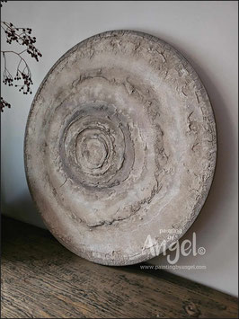 Abstract landelijke muurcirkel volledig voorzien van versteende texturen in rustiek oud taupegrijs gecombineerd met verkalkte aardetinten en antraciet, diameter 80cm, Deze afmeting zal met DHL verzonden worden en daardoor kan het pakket langer onderweg zijn.